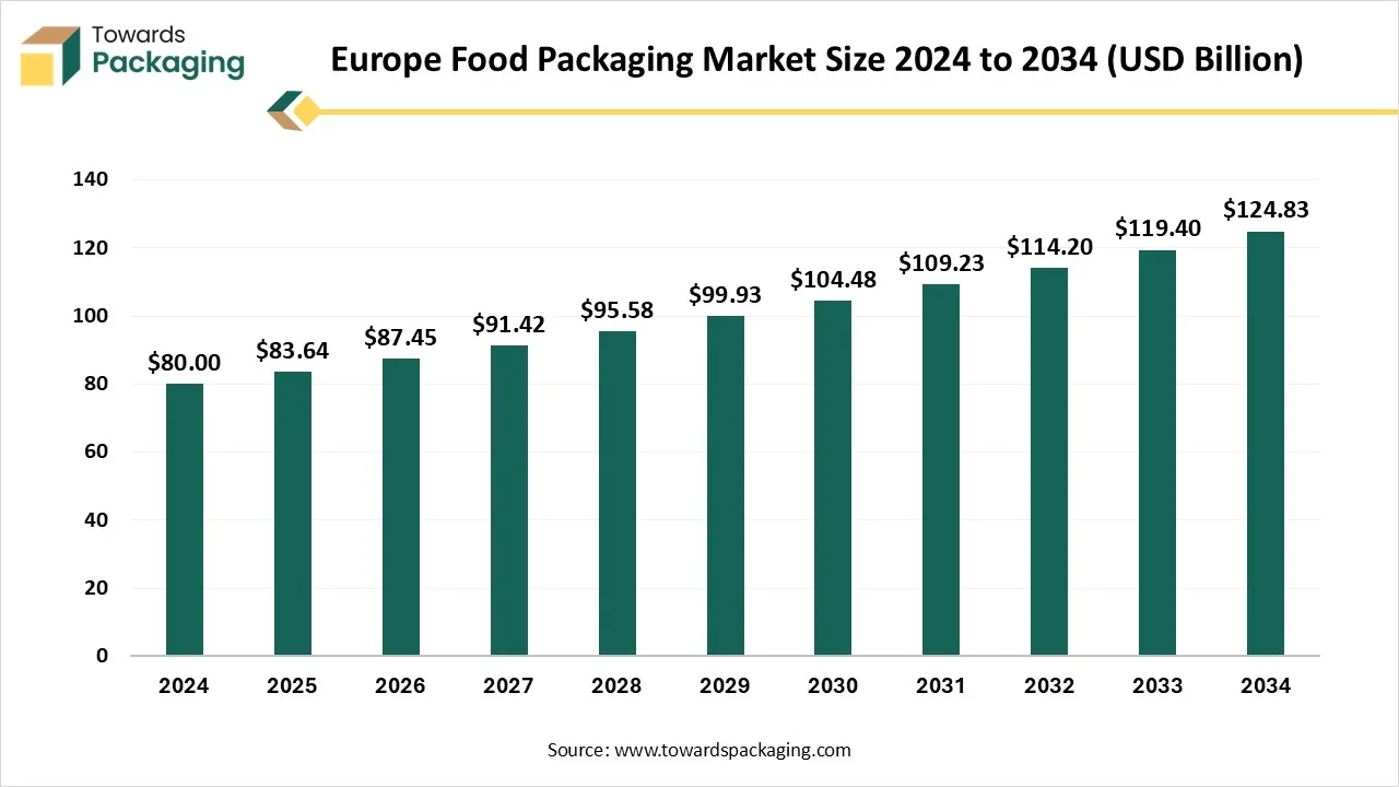 According to Towards Packaging consultants, the global Europe food packaging market is projected to reach approximately USD 124.83 billion by 2034, increasing from USD 83.64 billion in 2025, at a CAGR of 4.1% during the forecast period 2025 to 2034.